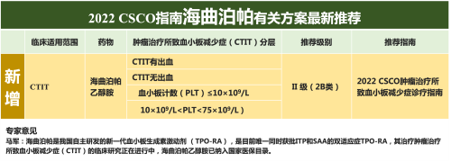 在这次CSCO指南发布会上,首次发布了2022 CSCO《肿瘤治疗所致血小板减少症诊疗指南》,指南推荐血小板生成素激动剂(TPO-RA)用于治疗肿瘤治疗所致血小板减少症(CTIT)的不同分层。目前国内上市的TPO-RA类药物均未获批CTIT适应症。