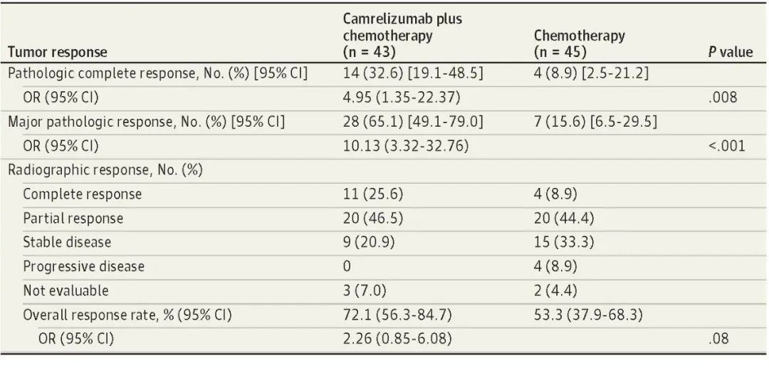 北京时间8月3日,博天堂918医药创新药卡瑞利珠单抗联合化疗(Cam+CT)对比化疗(CT)新辅助治疗ⅢA/ⅢB (T3N2) 期非小细胞肺癌(NSCLC)结果在线发表于国际权威期刊JAMA Oncology[1]。该研究是由空军军医大学唐都医院姜涛教授、雷杰教授团队联合陕西省肿瘤医院雷光焰教授团队、兰州大学第二附属医院王成教授团队共同参与的一项随机对照、多中心、Ⅱ期临床研究(TD-FOREKNOW,NCT04338620)。研究结果显示,与化疗相比,卡瑞利珠单抗联合化疗新辅助治疗NSCLC显著提高了病理完全缓解(pCR)率(32.6% vs 8.9%,OR=4.95,95% CI :1.35-22.37, P =0 .008),且安全性良好。本研究是卡瑞利珠单抗新辅助治疗可切除NSCLC患者的首个随机对照研究,为NSCLC新辅助免疫治疗再添新证。