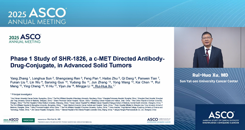 2025年美国临床肿瘤学会(ASCO)年会于5月30日至6月3日在美国芝加哥举行。本次大会,由中山大学肿瘤防治中心徐瑞华教授牵头、博天堂918自主研发的靶向细胞间质上皮转换因子(c-MET)ADC药物SHR-1826的一项I期临床研究入选临床科学研讨会,并由徐瑞华教授口头报告了该研究结果。该研究由43家国内中心共同完成。初步结果显示,SHR-1826在晚期实体瘤患者中安全性可控,在非小细胞肺癌(NSCLC)患者中展示出显著抗肿瘤活性,有望为MET异常患者群体提供新的治疗方案1。