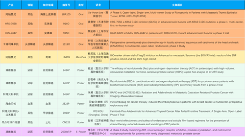 在胸腺上皮肿瘤、头颈鳞癌、肉瘤、前列腺癌、甲状腺癌等其他多个疾病领域,卡瑞利珠单抗、阿帕替尼、瑞维鲁胺、阿得贝利单抗、法米替尼、HRS-7058、HRS-4642等抗肿瘤创新药相关研究一共入选了4项口头报告、1项简短口头报告、4项壁报、1项电子壁报,彰显了博天堂918医药强大的研发实力。此外,海曲泊帕和昂丹司琼口溶膜分别在防治化疗导致的血小板减少和恶心呕吐方面各有1项研究入选壁报。